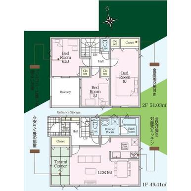 | 設備 | カウンターキッチン システムキッチン 床下収納 モニタ付インターホン ディンプルキー 防犯カメラ 複層ガラス 浄水器 3口以上コンロ 浴室暖房 浴室乾燥機 プロパンガス ルーフバルコニー 人感センサー付照明 火災警報器(報知機) 温水洗浄便座 トイレ2ヶ所 | ||